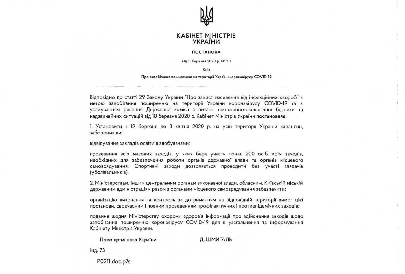 11-го березня Уряд України затвердив заходи, які необхідно вжити через загрозу епідемії коронавірусної інфекції в Україні та для недопущення поширення COVID-19. Кабінетом Міністрів України (постанова №211 від 11.03.2020 р.) вирішено ввести обмеження на проведення масових заходів, у яких запланована участь 200 та більше осіб. Проведення спортивних заходів можливе з дозволу міжнародних організацій і без глядачів.