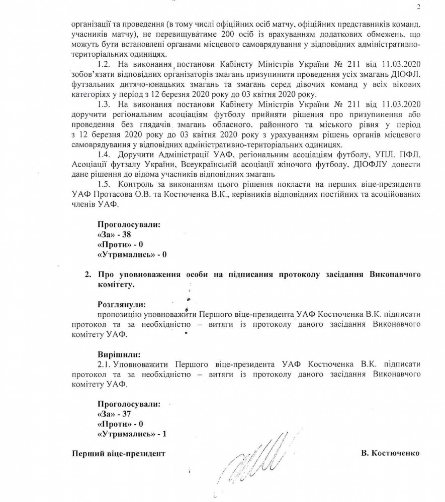 - доручити регіональним асоціаціям футболу прийняти рішення про призупинення або проведення без глядачів змагань обласного, районного та міського рівня у період із 12 березня до 3 квітня 2020 року з урахуванням рішень органів місцевого самоврядування у відповідних адміністративно-територіальних одиницях.